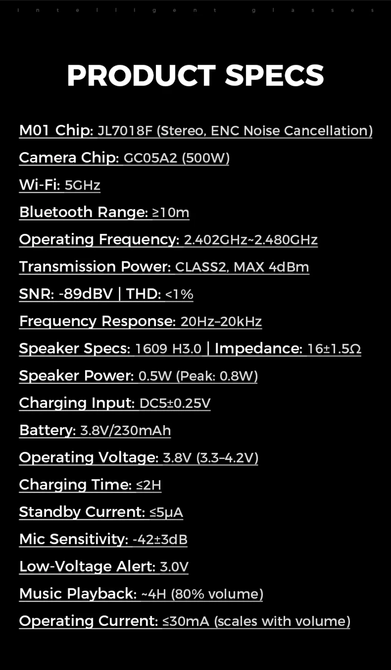 Main Functions : Wake up by voice, music playback, music control, receive calls, shooting, access to Chat GPT large model, see the picture in kind, real-time translation, etc., shooting anti-shake, wifi transmission, dual-microphone noise reduction, single-point touch, wear detection, etc.